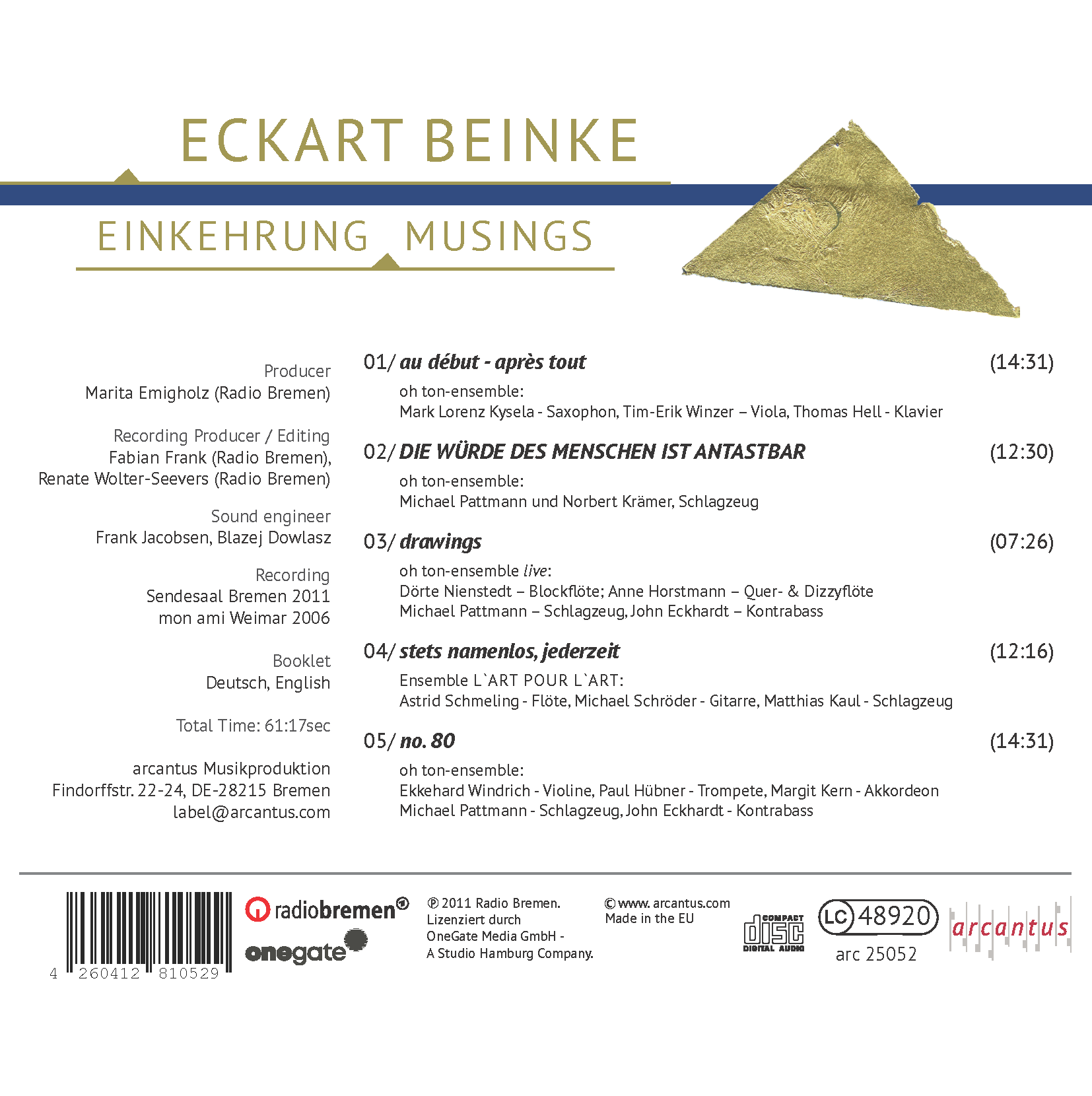 Diese CD präsentiert fünf Werke von Eckart Beinke, die den Hörer in Klangräume führen, in denen Intuition, Fragilität und innere Wachheit miteinander verschmelzen. Beinke verweigert sich jeder Oberflächenästhetik und richtet den Blick konsequent auf das Subtile, das Ungesagte – auf jene feinen Schwingungen, in denen Emotion, Erinnerung und Gedanke ineinander übergehen. Jedes Stück entfaltet eine eigene Topografie des Hörens: Mal als tastende Exploration neuer Anfänge, mal als politisch sensibilisierte Reflexion, mal als klangmalerische Annäherung an Natur, Zufall oder das Unbewusste. Dabei verschieben sich Grenzen zwischen Geräusch und Ton, zwischen Struktur und Freiheit, zwischen persönlicher Geste und gesellschaftlicher Wachsamkeit. Diese CD ist eine Einladung, Klang als Denkraum zu erleben – als Ort, an dem Wahrnehmung sich weitet und das Hören selbst zum letzten stillen Luxus wird. – note 1 music: Neuheiten Februar 2026 (Pdf-Version)